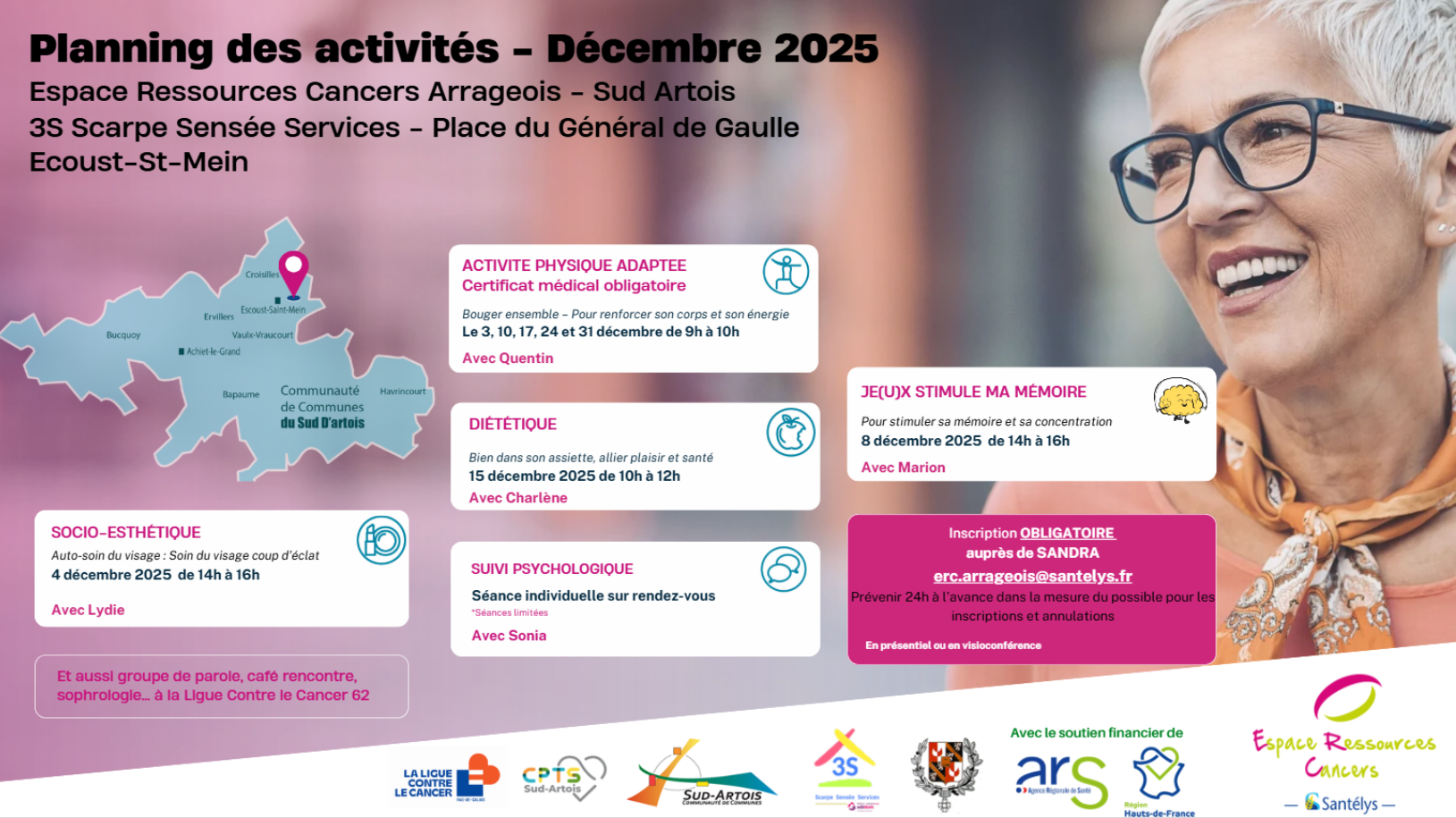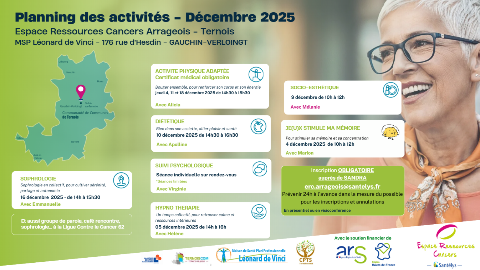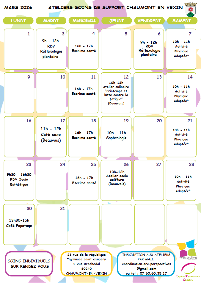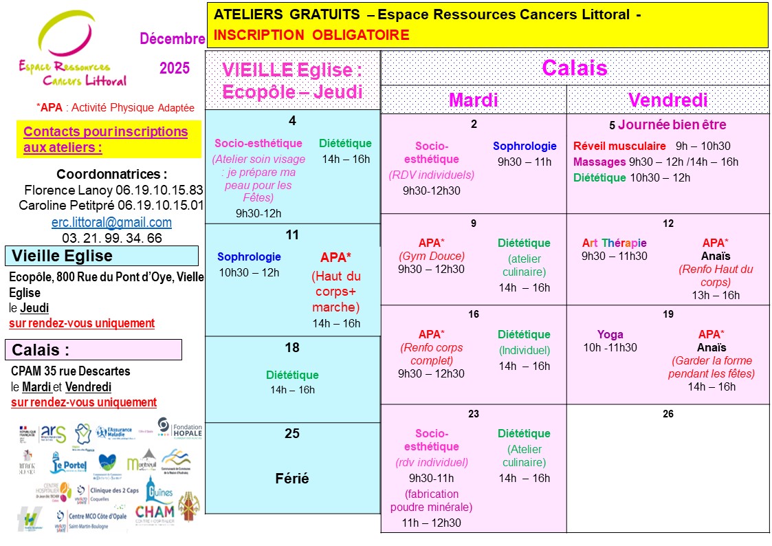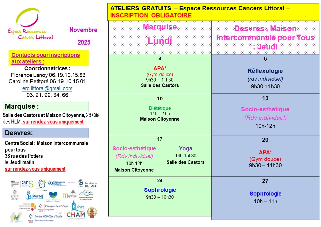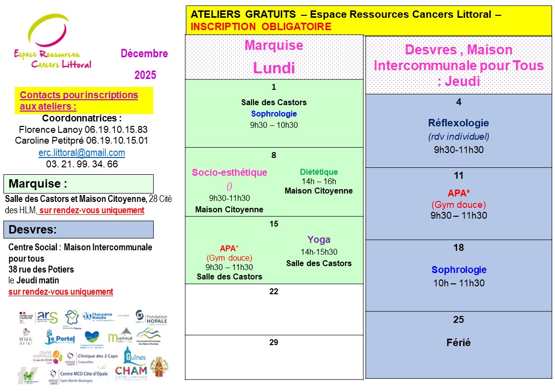 Les ERCEspace Ressources Cancers permettent aux personnes atteintes d’un cancer de bénéficier de soins oncologiques de support, de pratiquer librement des activités individuelles ou collectives adaptées à leur état de santé et qui améliorent leur qualité de vie : diététique, groupes de parole, activités physiques, sophrologie, accompagnement psychologique, ateliers créatifs, soins socio esthétiques…