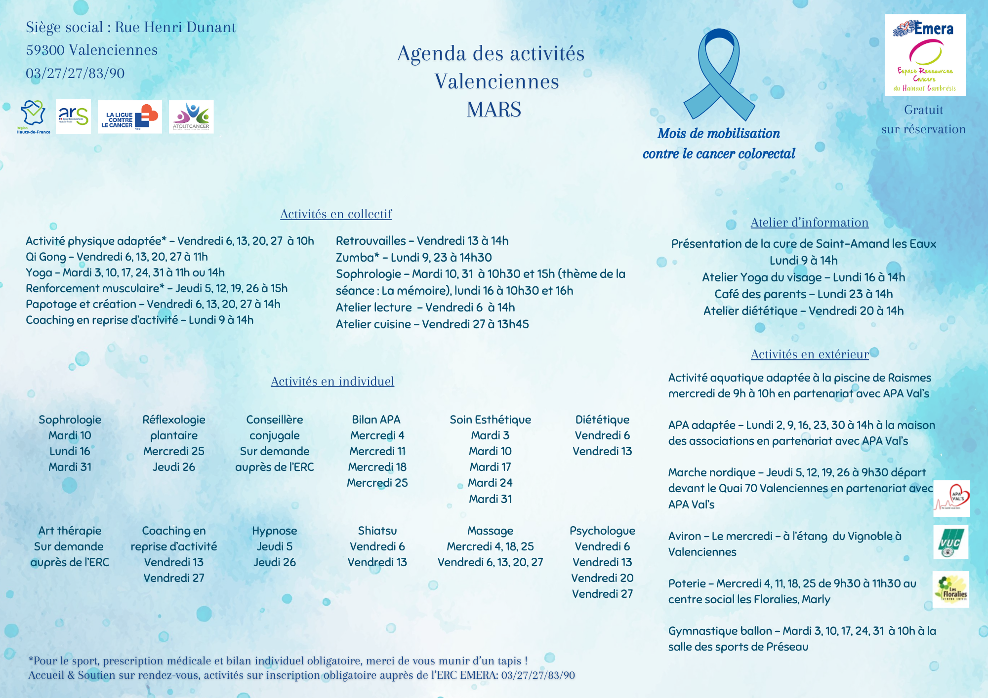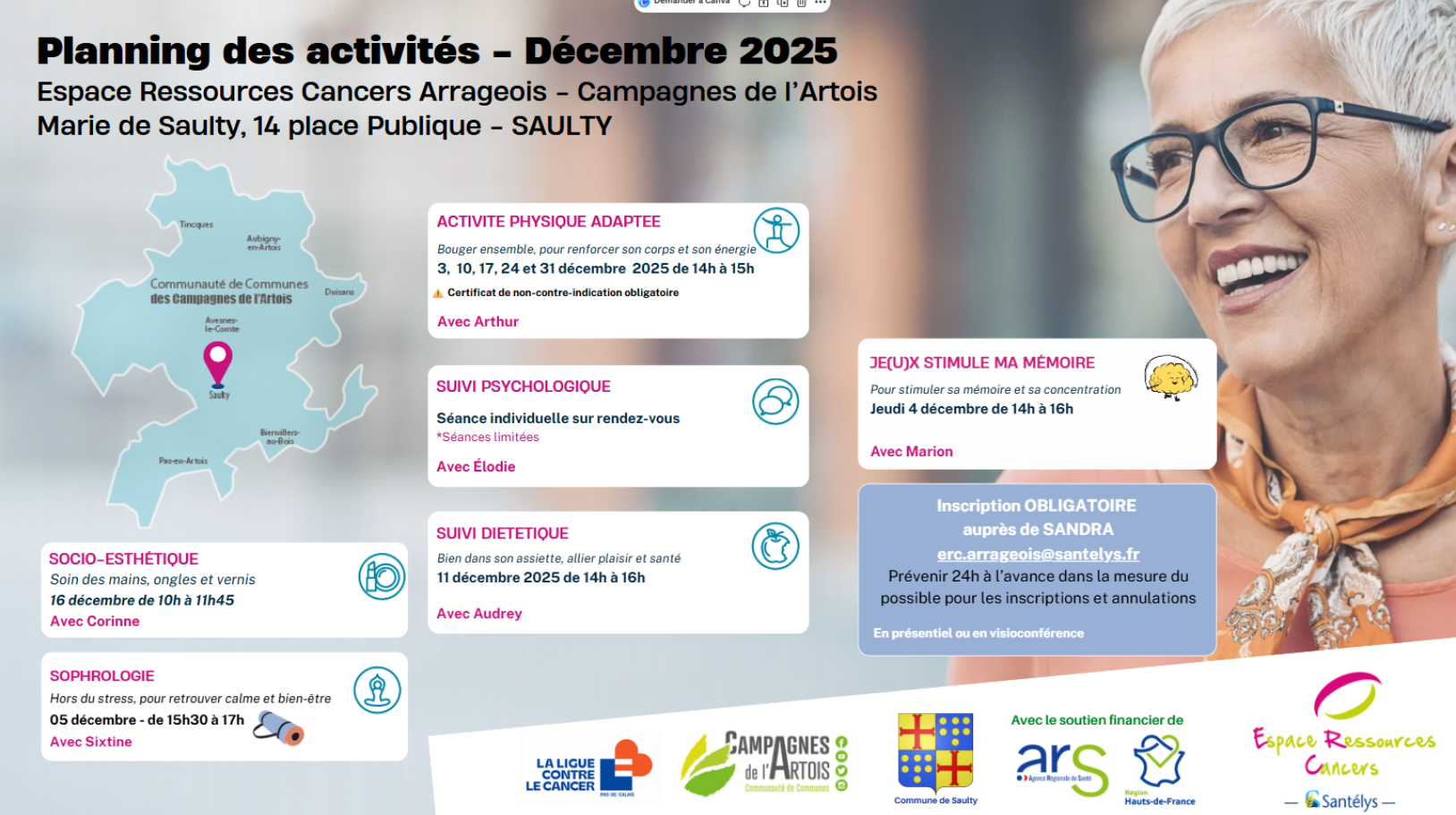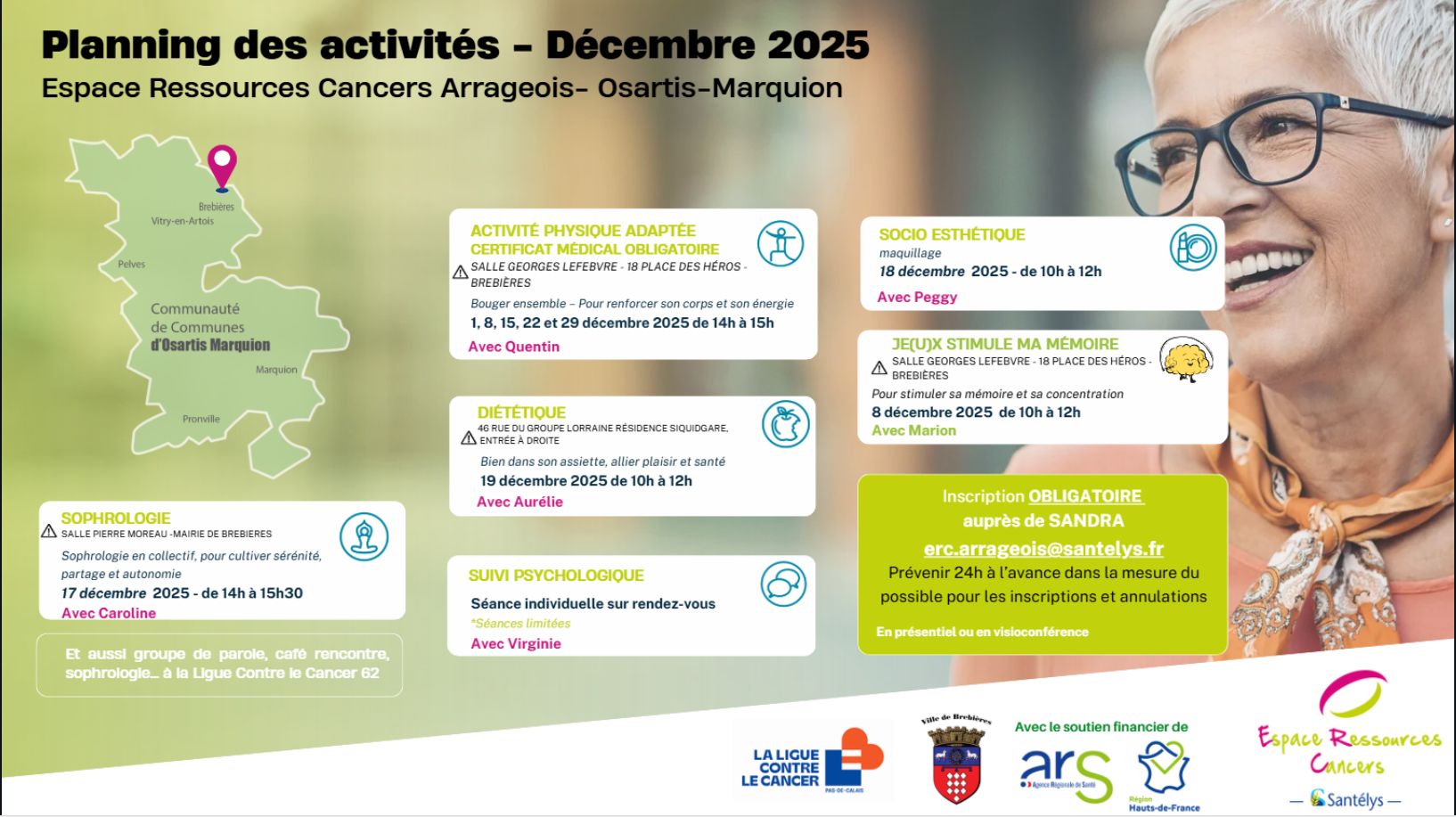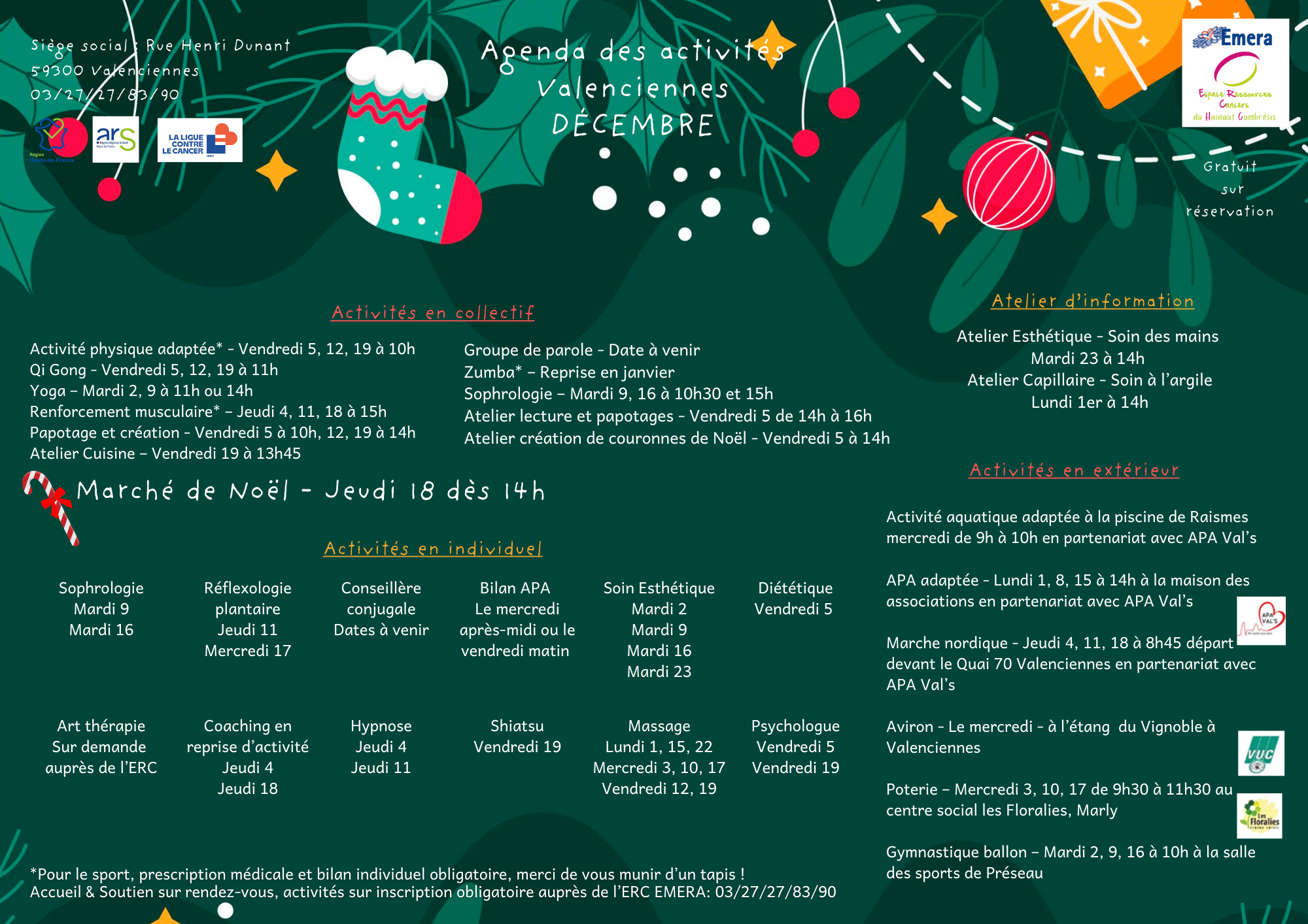 Les ERCEspace Ressources Cancers permettent aux personnes atteintes d’un cancer de bénéficier de soins oncologiques de support, de pratiquer librement des activités individuelles ou collectives adaptées à leur état de santé et qui améliorent leur qualité de vie : diététique, groupes de parole, activités physiques, sophrologie, accompagnement psychologique, ateliers créatifs, soins socio esthétiques…